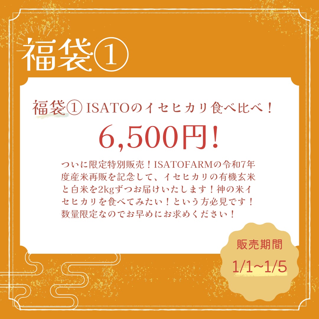 ISATOFARMの令和7年度産米再販を記念して、イセヒカリの有機玄米と白米を2kgずつセットにした特別福袋をお届けいたします!